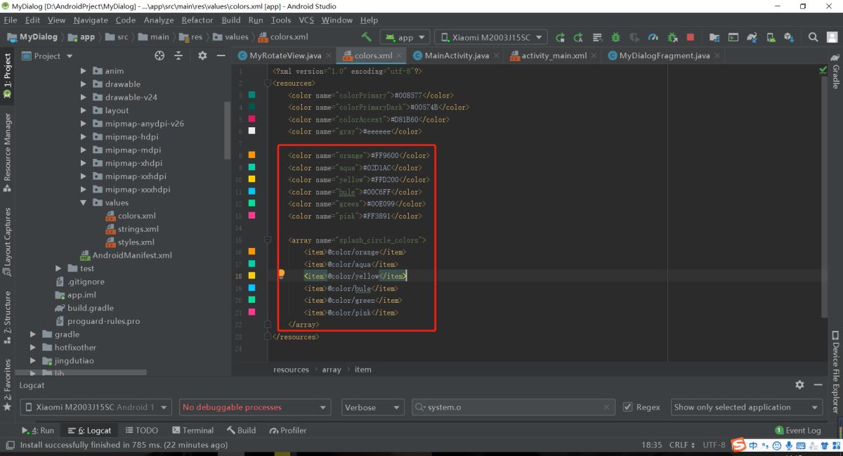 第一步:准备好颜色数组 res => values => colors.xml