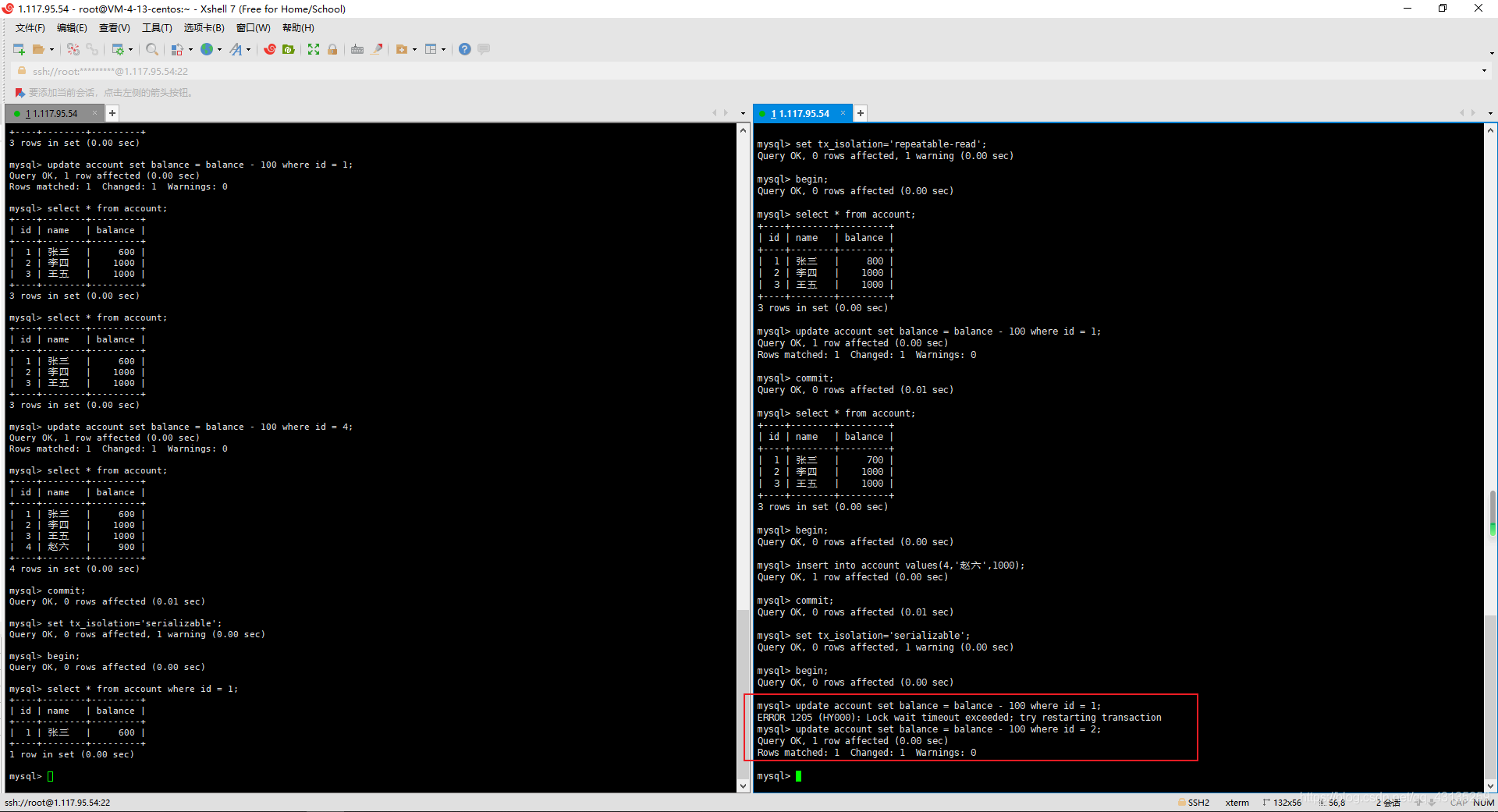 4.1 设置隔离级别串行化:set tx_isolation=‘serializable';