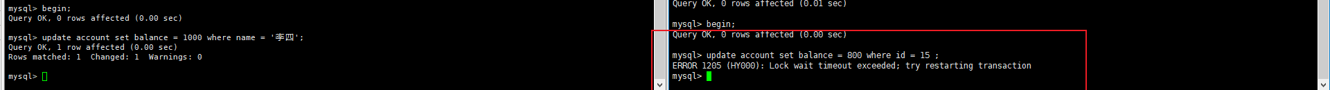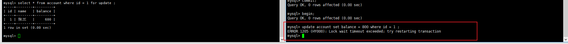4.3 在客户端A未提交的时候,客户端B执行update account set balance = 800 where id = 1 ;会被阻塞至客户端A提交或者超时;