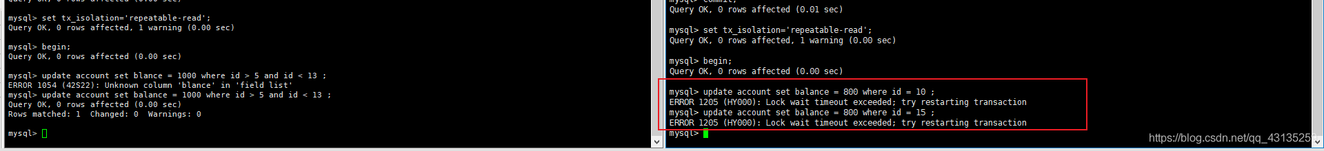 3.3 在客户端A未提交的时候,客户端B执行update account set balance = 800 where id = 15 ;同样会被阻塞至客户端A提交或者超时;