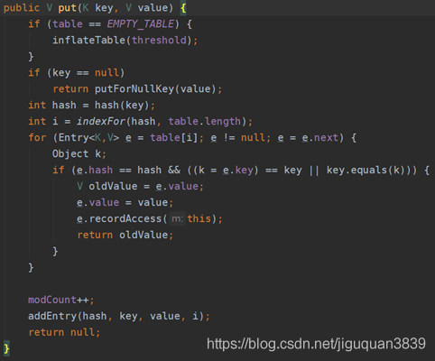 回来说put方法,如果key是null,调用putForNullKey方法,保存null与key,这是HashMap允许为null的原因。然后计算hash值和用indexFor计算数据存在的位置,然后从i出开始迭代e,找到 key 保存的位置。