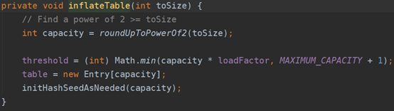 首先判断是否是空数组(table == EMPTY_TABLE),如果是,开始初始化HashMap的table数据结构,然后执行扩容函数,如果未指定容量,默认是大小为16的表,然后根据加载因子计算临界值。什么是加载因子呢?hashMap的大小是一定的,如果不够存储了肯定要扩容,那么扩容的依据是什么呢,什么时候确定要扩容了呢?这个时候就需要引入加载因子这个概念,我们假使依旧使用默认大小16,加载因子0.75,那么当hashMap的size大于12(16*0.75=12)的时候,那么就会进行扩容。