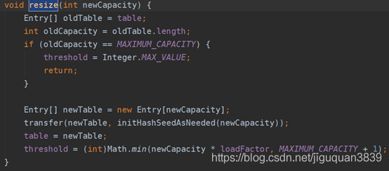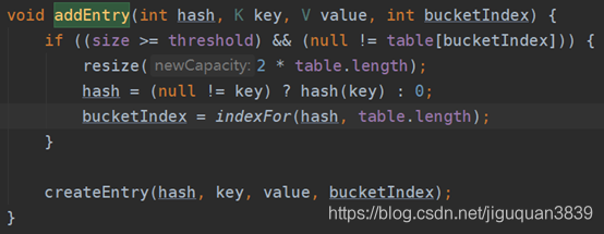 当size大于等于某一个阈值thresholdde时候且该table并不是一个空table,因为size 已经大于等于阈值了,说明Entry数量较多,哈希冲突严重,那么若该Entry对应的桶不是一个空桶,这个Entry的加入必然会把原来的链表拉得更长,因此需要扩容;若对应的桶是一个空桶,那么此时没有必要扩容。如果扩容,table会扩容为原来的两倍,直到达到数组的最大长度1<<30(2的30次方),如果size大于这个值,那么就直接修改为Integer.MAX_VALUE。扩容后的元素hash值对应的新的桶位置,然后在指定的桶位置上,创建一个新的Entry。
