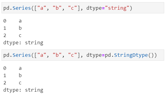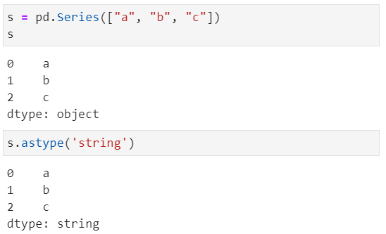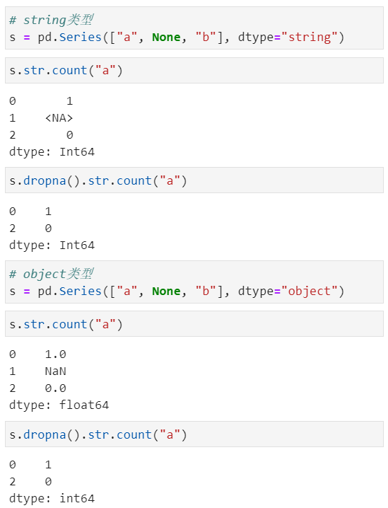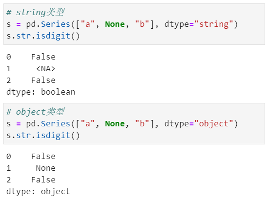 对于sting来说,返回数字输出的字符串访问器方法将始终返回可为空的整数类型;对于object来说,是 int 或 float,具体取决于 NA 值的存在