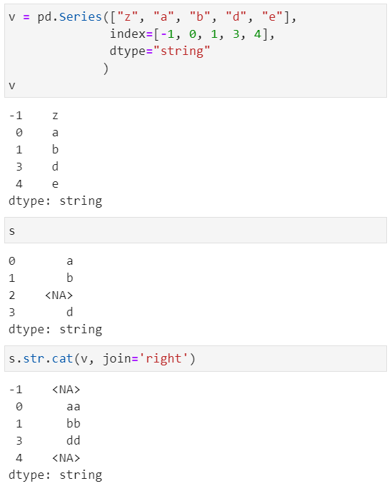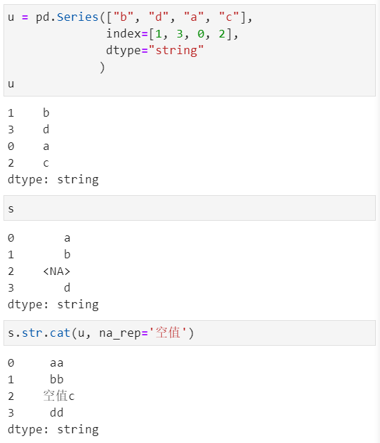 连接一个序列和另一个等长的列表,默认情况下如果有缺失值,则会导致结果中也有缺失值,不过可以通过指定缺失值na_rep的情况进行处理