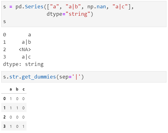 我们还可以从字符串列中提取虚拟变量,例如用"|"分隔(第一行abc只有a,第二行有a和b,第三行都没有,第四行有a和c):