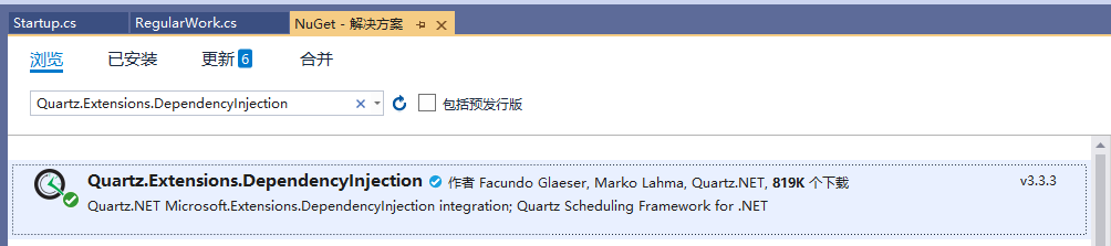 项目创建好后,我们需要在NuGet包管理器中安装Quartz.AspNetCore和Quartz.Extensions.DependencyInjection