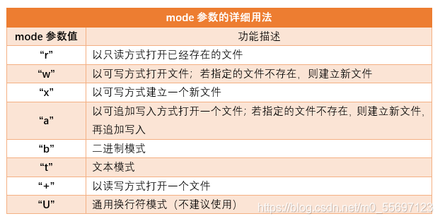mode默认值为“rt”模式,意味着对文本文件进行读操作。目前,mode值常见可以组合的方式为“rb"、”wb“、”xb“、”ab“、”rt“、”wt“、”xt“、”at“、”r+“、”w+“、”x+“、”a+“。