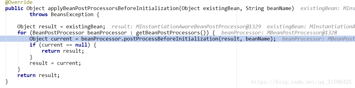 可以看出是在在初始化之前,具体是属性填充之前。(初始化之前,实例化之后) 如果返回fales,则不会继续初始化,即不会属性填充。