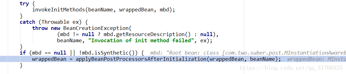 看以看出populateBean(初始化bean)-------------------》beanpostBeforeInitialization---------------------------------->invokeinitMethods(配置的init-method)------->postProcessAfterInitialization