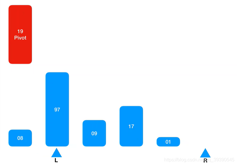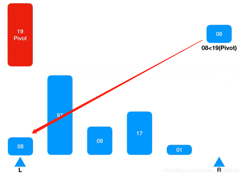 8.继续从左边坐标 + 1 取值继续匹配,则取到Arr[L] = 17,又小于基准值,则忽略并跳过,继续找Arr[L + 1]继续匹配。