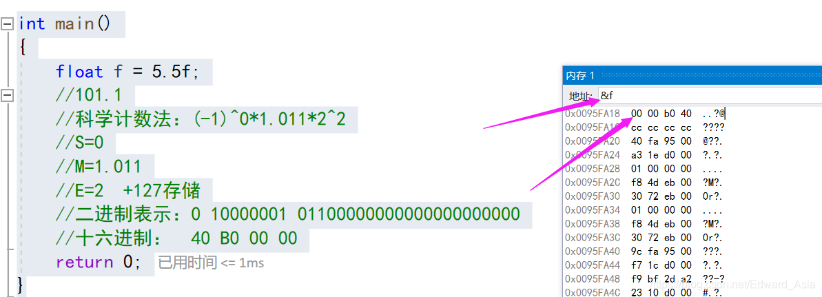 浮点数存储的例子: