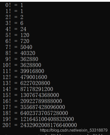 打印出数字一到数字20的阶乘