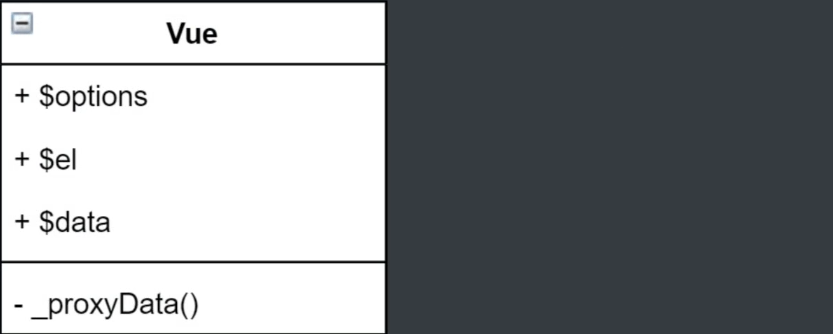 如上图所示:vue类中有三个属性,分别是$options,$el,$data,这三个属性记录构造函数中传过来的参数。_proxyData为vue类中的方法
