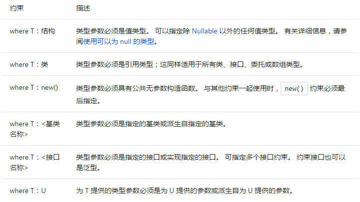 定义泛型类时,可以对客户端代码能够在实例化类时用于类型参数的几种类型施加限制。 如果客户端代码尝试使用约束所不允许的类型来实例化类,则会产生编译时错误。 这些限制称为约束。 通过使用where上下文关键字指定约束。 下表列出了六种类型的约束: