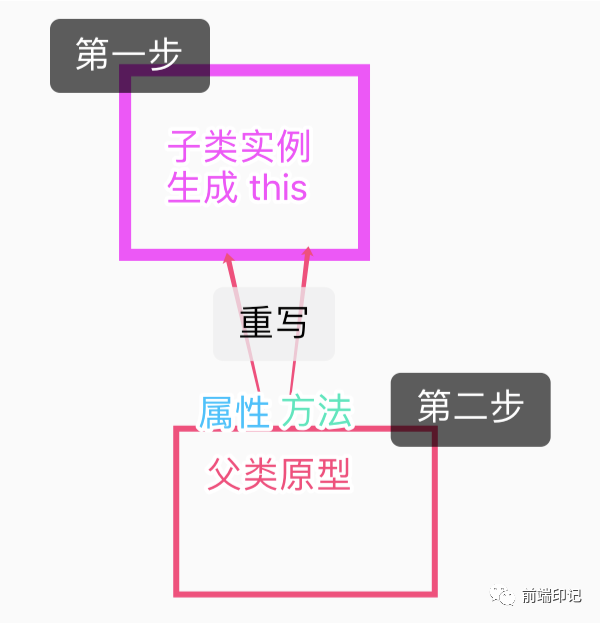 子类的 prototype 为父类对象的一个实例。因此子类的原型对象包含指向父类的原型对象的指针,父类的实例属性为子类原型的属性。