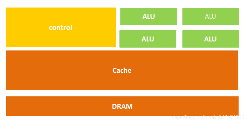 因为CPU的架构中需要大量的空间去放置存储单元(橙色部分)和控制单元(黄色部分),相比之下计算单元(绿色部分)只占据了很小的一部分,所以它在大规模并行计算能力上极受限制,而更擅长于逻辑控制。