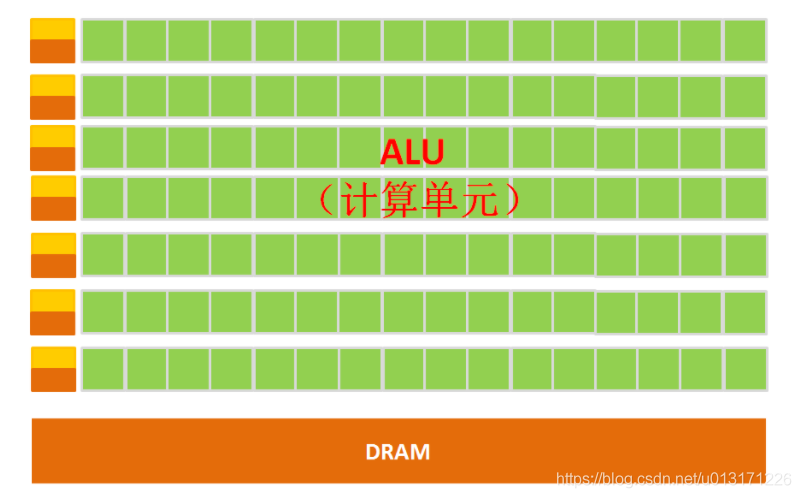 注:GPU中有很多的运算器ALU和很少的缓存cache,缓存的目的不是保存后面需要访问的数据的,这点和CPU不同,而是为线程thread提高服务的。如果有很多线程需要访问同一个相同的数据,缓存会合并这些访问,然后再去访问dram。