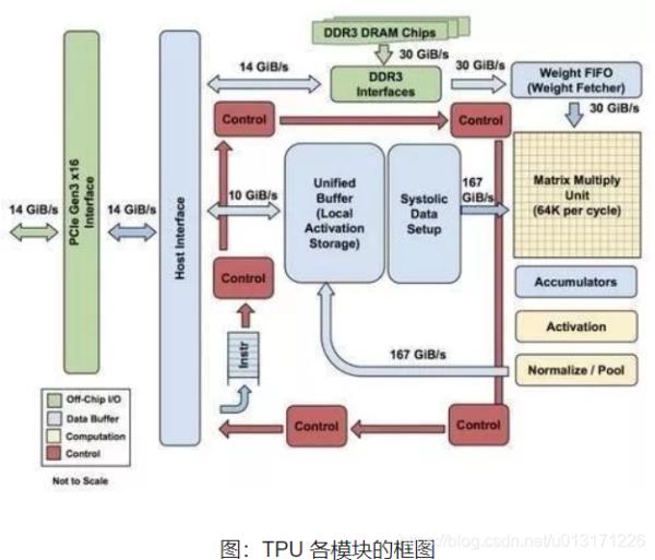 这表示谷歌充分意识到了片外内存访问是GPU能效比低的罪魁祸首,因此不惜成本的在芯片上放了巨大的内存。相比之下,英伟达同时期的K80只有8MB的片上内存,因此需要不断地去访问片外DRAM。