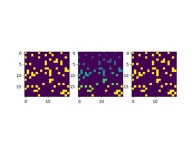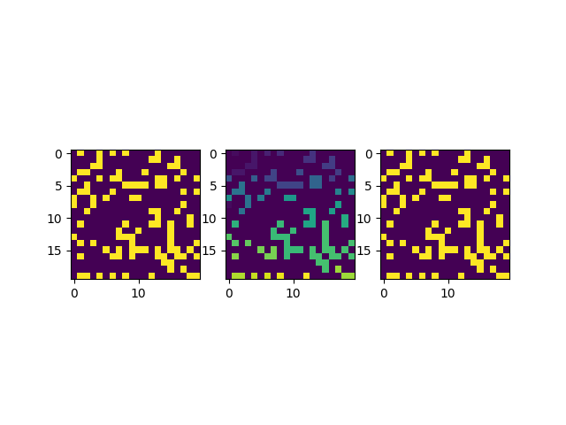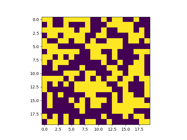 这里我们以Python3为例,可以用Numpy来产生一系列随机的0-1矩阵,这里我们产生一个20*20大小的矩阵: