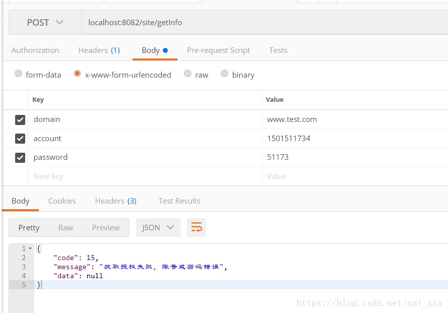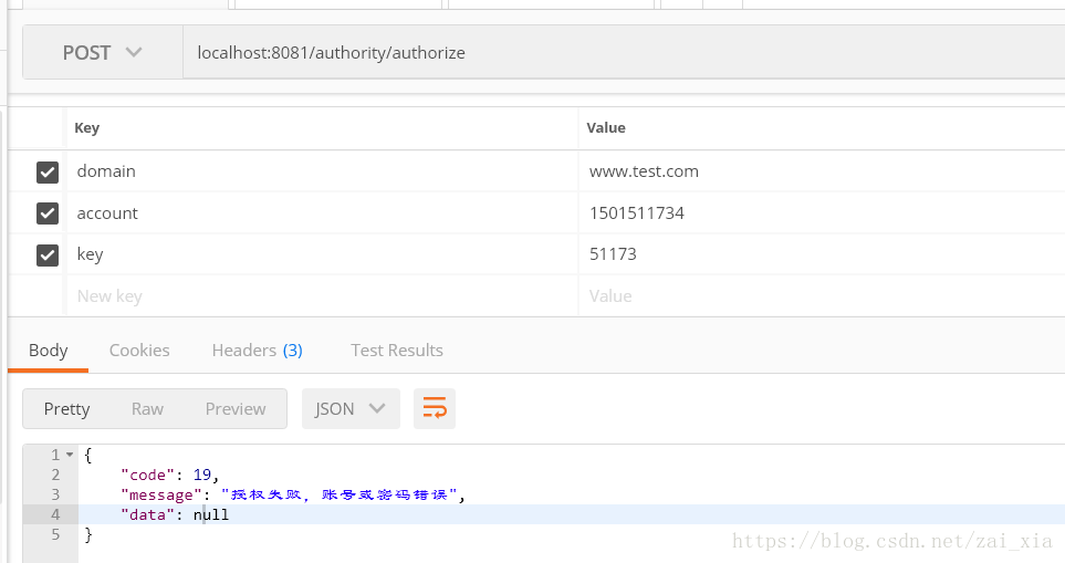 我要访问的api是 localhost:8081/authority/authorize,这个api需要传递三个参数,分别是domain(域名),account(用户账号),key(用户秘钥)。先用postman测试一下,返回结果如下: