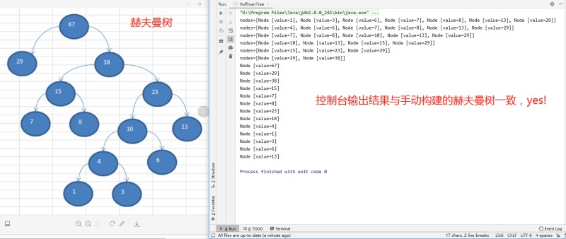 - 再将这颗新的二叉树,以根结点的权值大小再次排序,不断重复1-2-3-4的步骤,直到数列中,所有的数据都被处理,就得到一颗赫夫曼树