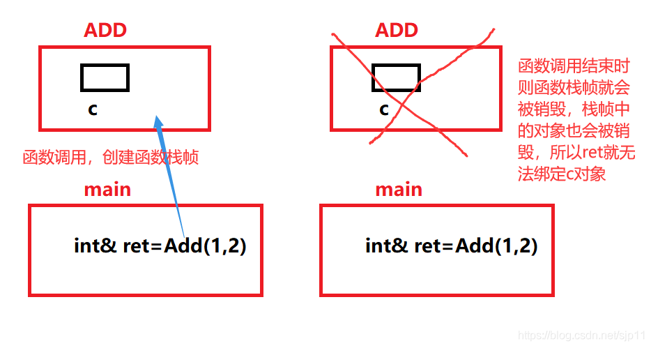 //这是错误的:因为c出了函数作用域后则会被销毁,则c这块空间就不存在