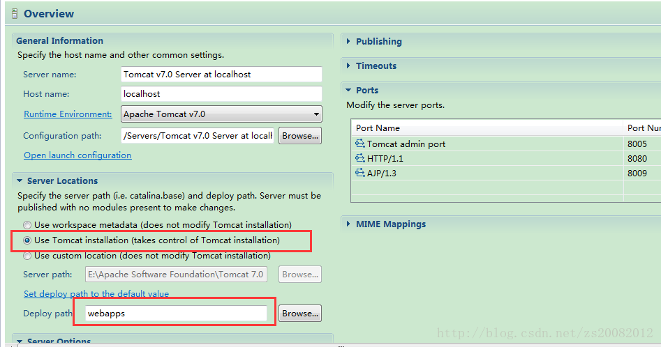 这时再次双击“Tomcat v7.0 Server at localhost”节点,使用Tomcat的安装目录作为部署的位置,并修改部署的路径Deploy path(建议改成Tomcat的webapps目录下),然后保存即可。