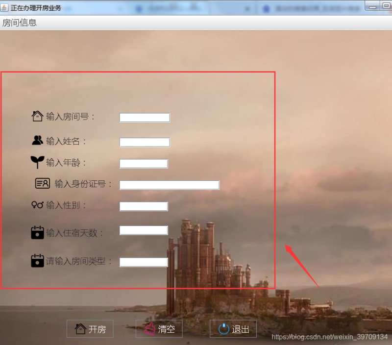 JOptionPane.showMessageDialog(null, "输入的信息有误,开房失败!");