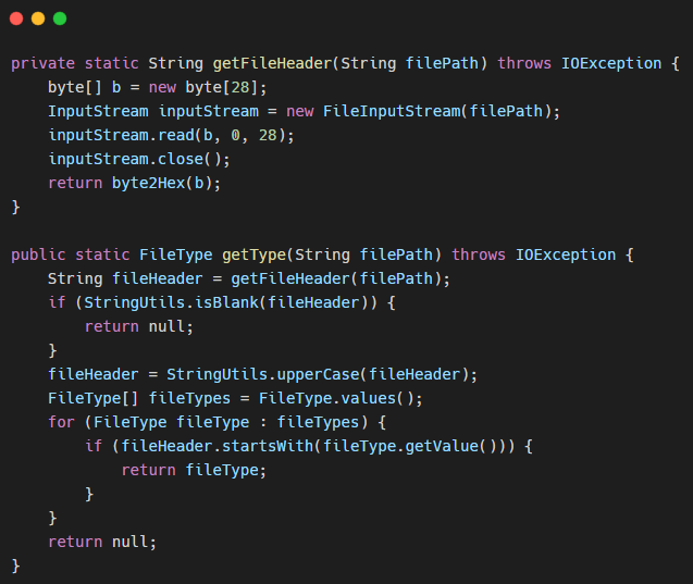 其中对上传文件的类型进行白名单校验,并不能单单通过后缀名称来判断文件的类型,因为攻击者很有可能可以通过将可执行文件的后缀名称改为其他可上传的后缀名称进行上传,因为判断文件类型就需要使用更加安全的方式。