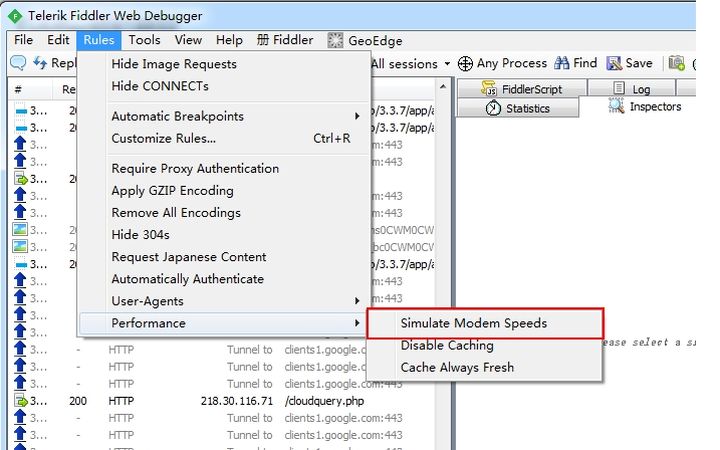 打开Fiddler,Rules->Performance->勾选 Simulate Modem Speeds,勾选之后访问网站会发现网络慢了很多。