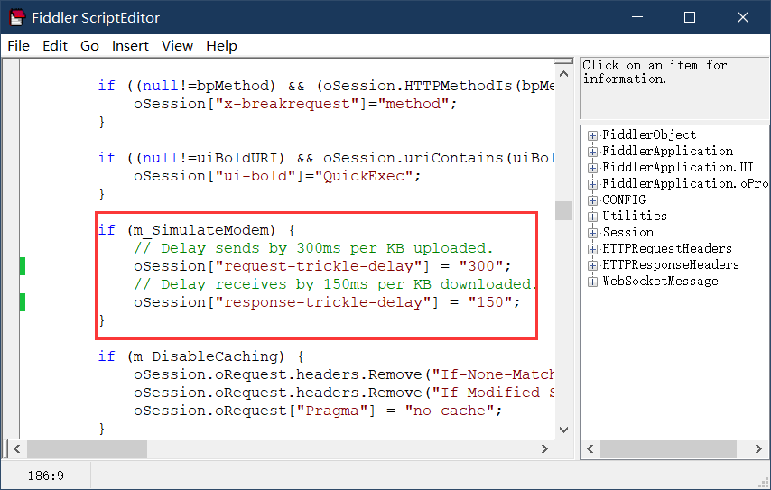 如果你想设置下载的速度为50KB/s,你则需要设置Delay 时间为 20ms。也可以限制上传的速度,调整oSession[“response-trickle-delay”]的值即可。