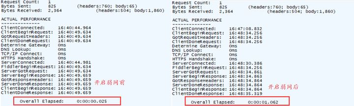 同样的接口,开启弱网前后分别运行一次,查看统计数据。