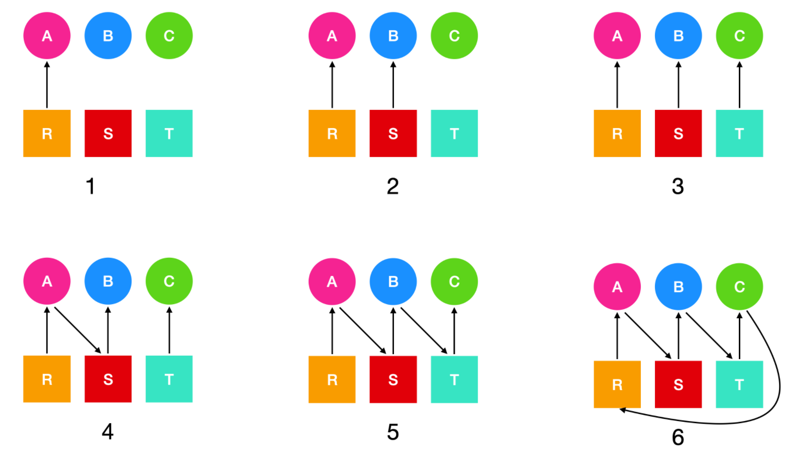 在上面的第四个步骤,进程 A 正在等待资源 S;第五个步骤中,进程 B 在等待资源 T;第六个步骤中,进程 C 在等待资源 R,因此产生了环路并导致了死锁。