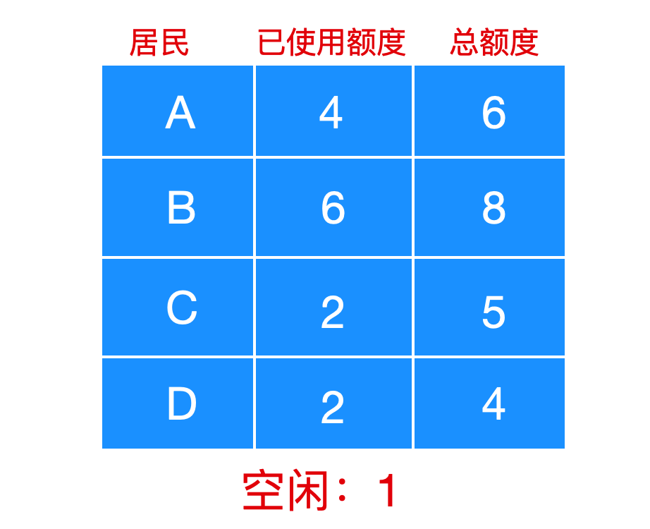 比如下面的例子,银行家一共为所有城镇居民提供了 15 单位个贷款额度,一个单位表示 1k 美元,如下所示