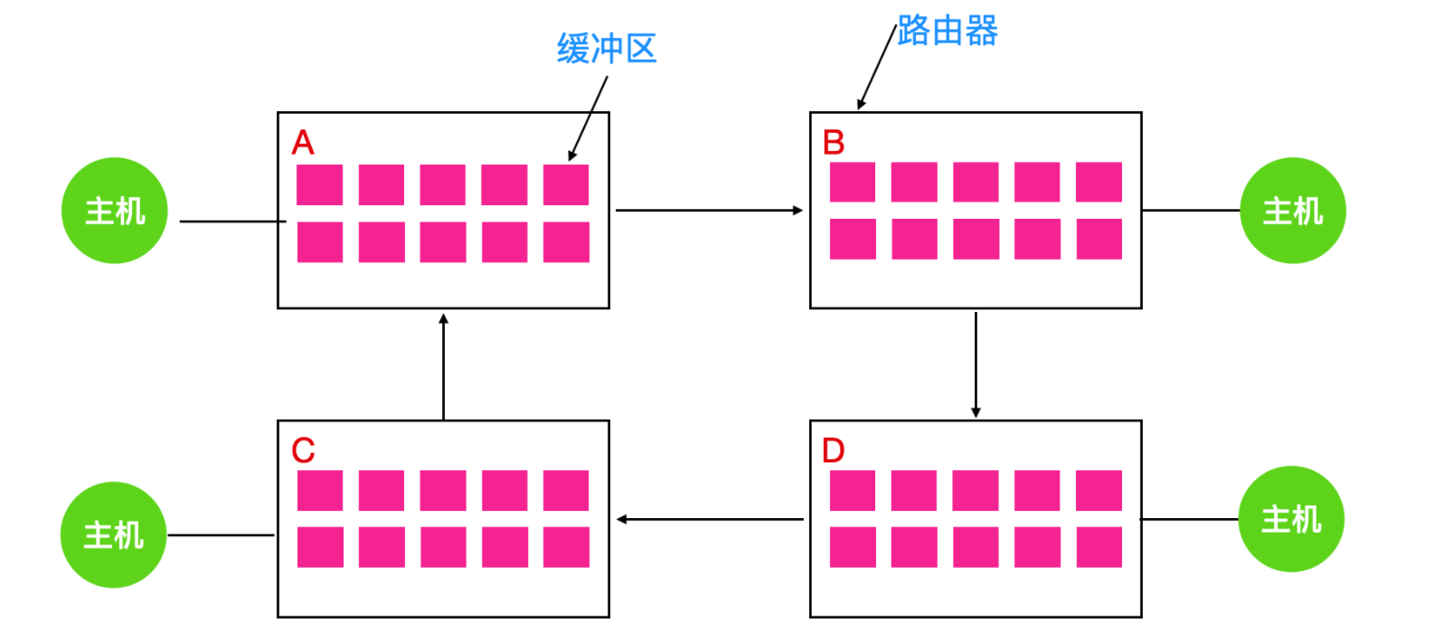 假如路由器 A 的所有数据需要发送到 B ,B 的所有数据包需要发送到 D,然后 D 的所有数据包需要发送到 A 。没有数据包可以移动,因为在另一端没有缓冲区可用,这就是一个典型的资源死锁。