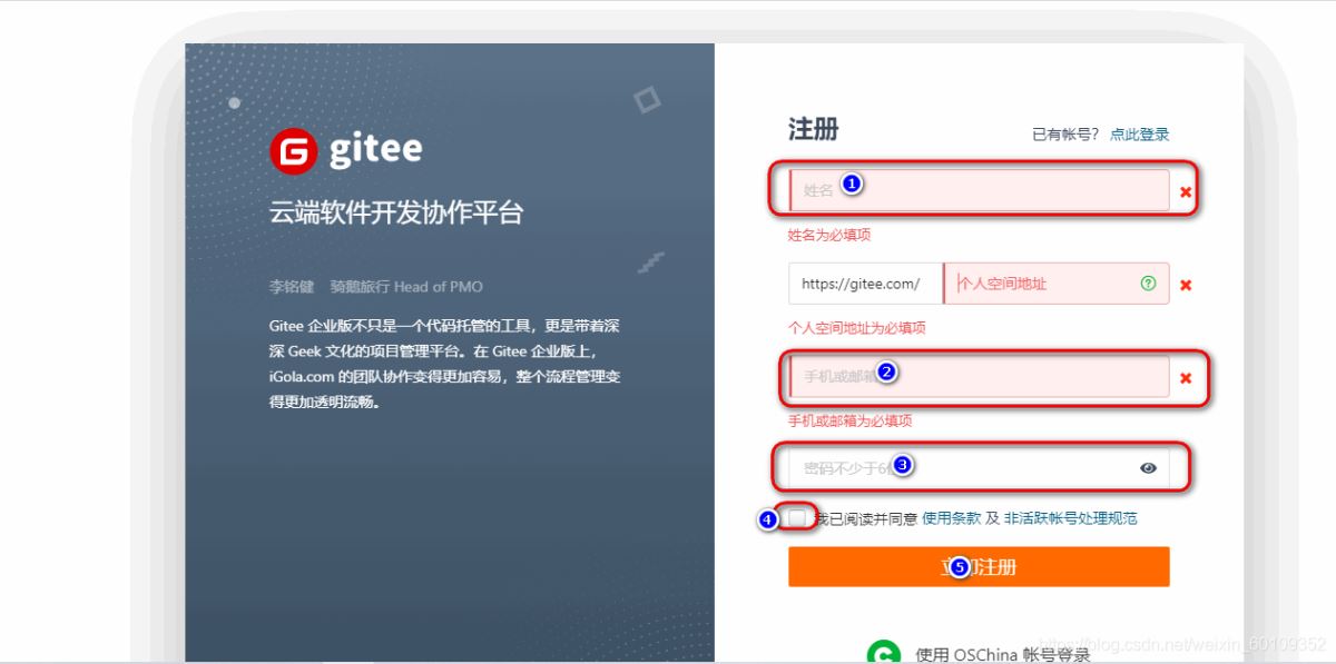 1.如果没有gitee账号,到gitee官网注册一个Gitee账号(注意:尽量不要有中文)