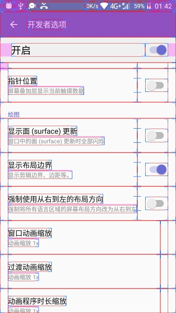 但如果说这个坐标是指left,top,right,bottom呢,那就不对了,为什么呢?因为经过我们刚刚对ViewPropertyAnimator的源码分析,知道了位移动画最终也只是调用了RenderNode的setTranslation方法,而left,top,right,bottom这四个值并没有改变。这时候可能有同学就会说了:我不信!既然没有真正改变它的坐标,那它接受触摸事件的区域怎么也会跟着移动呢?好吧,既然你不信,那我们来做个试验就知道了,这次需要到 设置 - 开发者选项 里面把显示布局边界这个选项打开: