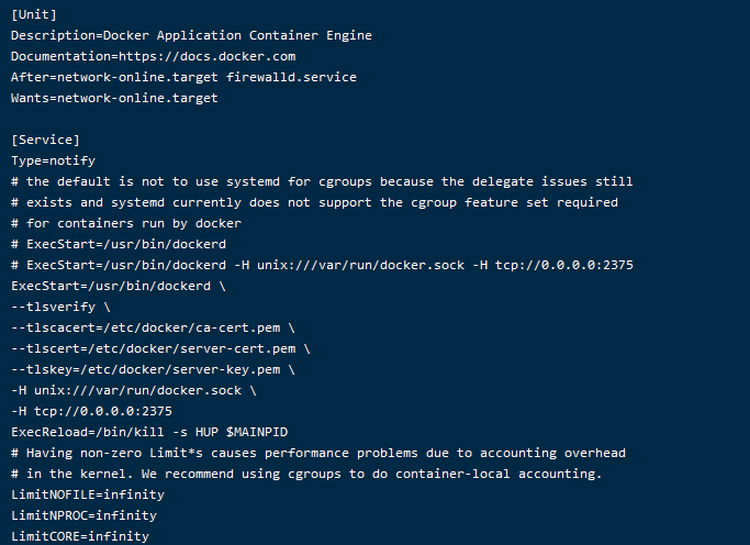 # 编辑文件 vim /etc/systemd/system/docker.service # 修改内容,注意证书的指定位置 ExecStart=/usr/bin/dockerd \ --tlsverify \ --tlscacert=/etc/docker/ca-cert.pem \ --tlscert=/etc/docker/server-cert.pem \ --tlskey=/etc/docker/server-key.pem \ -H unix:///var/run/docker.sock \ -H tcp://0.0.0.0:2375 # 重启服务 systemctl daemon-reload && systemctl restart docker