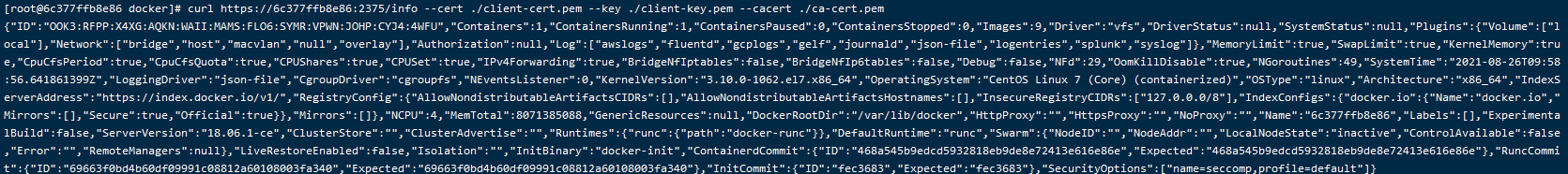 curl https://6c377ffb8e86:2375/info --cert ./client-cert.pem --key ./client-key.pem --cacert ./ca-cert.pem