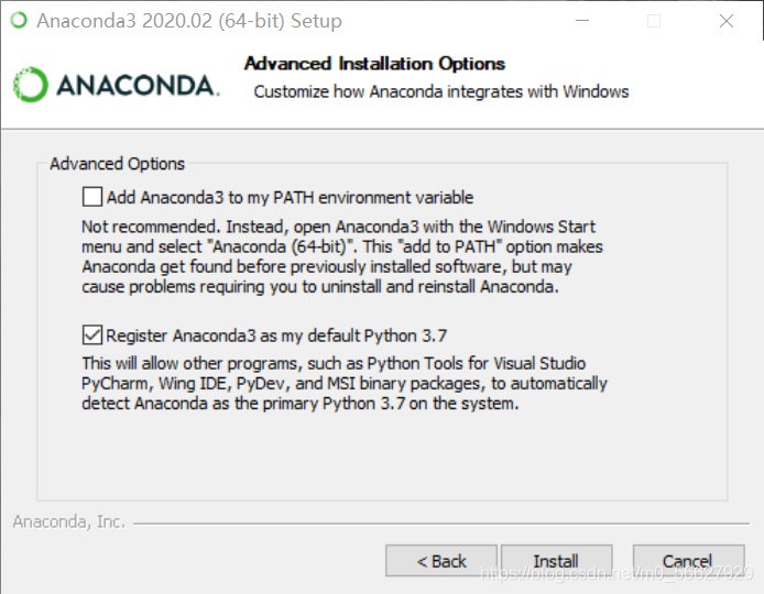 勾选Register Anaconda3 as my default Python3.7,不推荐勾选第一个