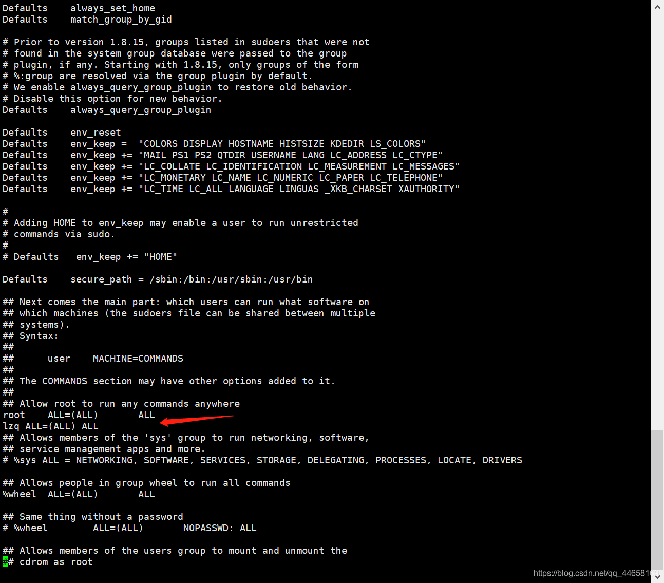编辑sudoers文件,添加lzq用户为所有可执行权限