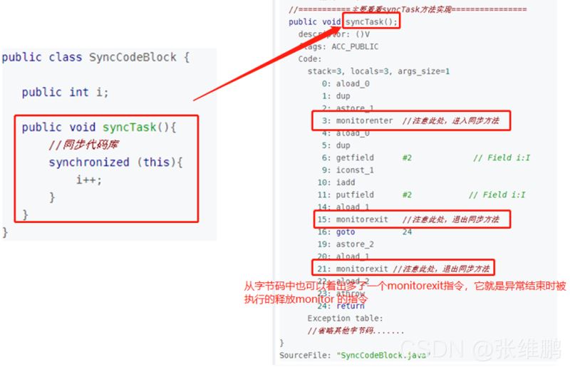 编译器会确保无论方法通过何种方式完成,无论是正常结束还是异常结束,代码中调用过的每条 monitorenter 指令都有执行其对应 monitorexit 指令。为了保证在方法异常完成时,monitorenter 和 monitorexit 指令依然可以正确配对执行,编译器会自动产生一个异常处理器,这个异常处理器可处理所有的异常,它的目的就是用来执行 monitorexit 指令。
