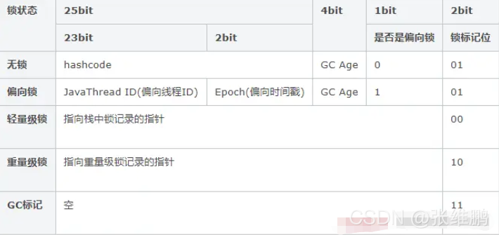 其中,Mark Word 记录了对象的 hashcode、分代年龄、锁标记位相关的信息,由于对象头的信息是与对象自身定义的数据没有关系的额外存储成本,因此考虑到 JVM 的空间效率,Mark Word 被设计成为一个非固定的数据结构,以便存储更多有效的数据,它会根据对象本身的状态复用自己的存储空间,在 32位 JVM 中的长度是 32 位,具体信息如下图所示:
