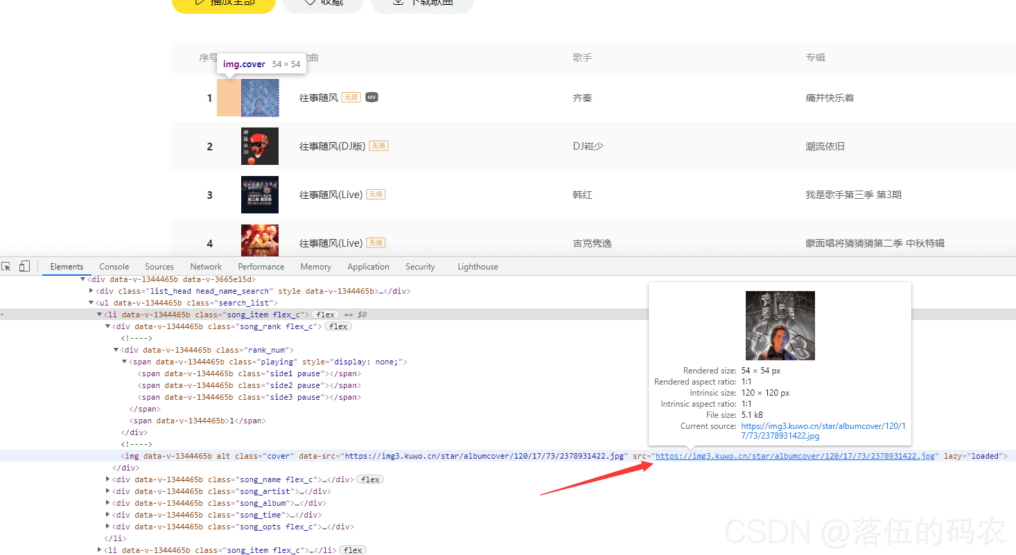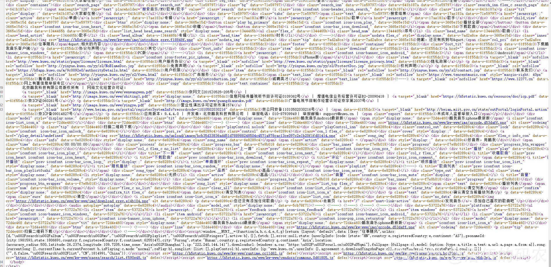 这些音乐的源文件地址是否在咱们的网页元素中,然后再查看网页源代码中是否有咱们需要的内容。(注:网页元素与网页源代码不一定是一样的,网页元素是经过浏览器渲染后的源代码,而源代码纯粹就是服务器给咱们传送过来的原始数据)