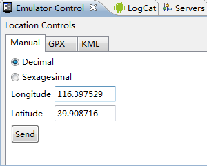 不过,使用geo命令还是挺麻烦的,ADT提供了一个设置模拟坐标的界面,打开“Emulator Control”视图,即可看到一下界面:
