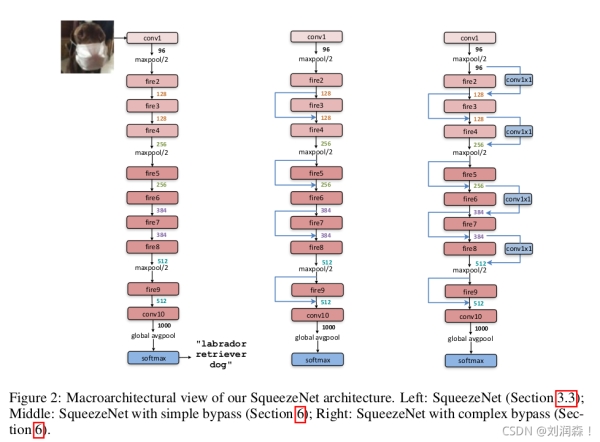 中间的网络结构在特征图通道数相同的 Fire 模块之间引入了残差网络中的跳跃连接,