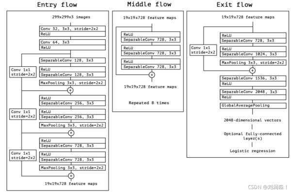 Xception 的结构基于 ResNet,但是将其中的卷积层换成了Separable Convolution(极致的 Inception模块)。