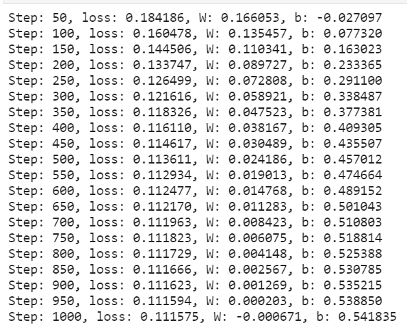 print("Step: %i, loss: %f, W: %f, b: %f" % (step, loss, W.numpy(), b.numpy()))