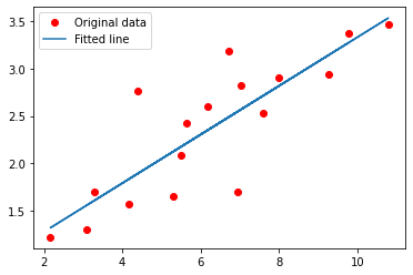 import matplotlib.pyplot as plt plt.plot(X, Y, 'ro', label='Original data') plt.plot(X, np.array(W * X + b), label='Fitted line') plt.legend() plt.show()